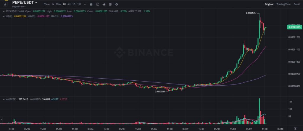 After losing more than 60% of its value in the beginning of 2025, Pepe Coin is up 43% at the time of writing with in a single day as Bitcoin reclaims above 100,000 USD on May 8th. The meme coin seems to set the upward momentum for other meme coins if Bitcoin shows resistance above 100K.